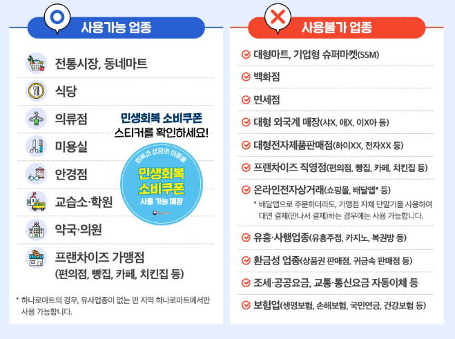 전통시장, 중소형 마트, 동네 식당, 약국 등에서 사용 가능합니다. 백화점, 대형마트, 유흥업소, 온라인몰 등에서는 사용이 불가합니다.