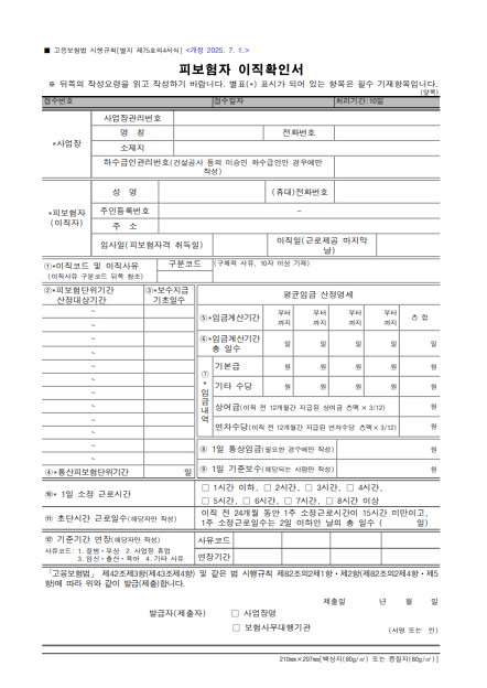 고용보험법 시행규칙 별지 제75호의4서식 기준으로 작성된 피보험자 이직확인서 양식을 내려받을 수 있습니다. 파일은 한글(.hwp)과 PDF 두 가지 형식으로 제공합니다.