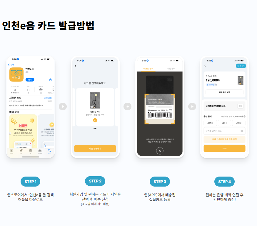 인천시민이라면 지금 인천e음 설치, 정책지원금 사용 설정, 가맹점 충전·결제를 통해