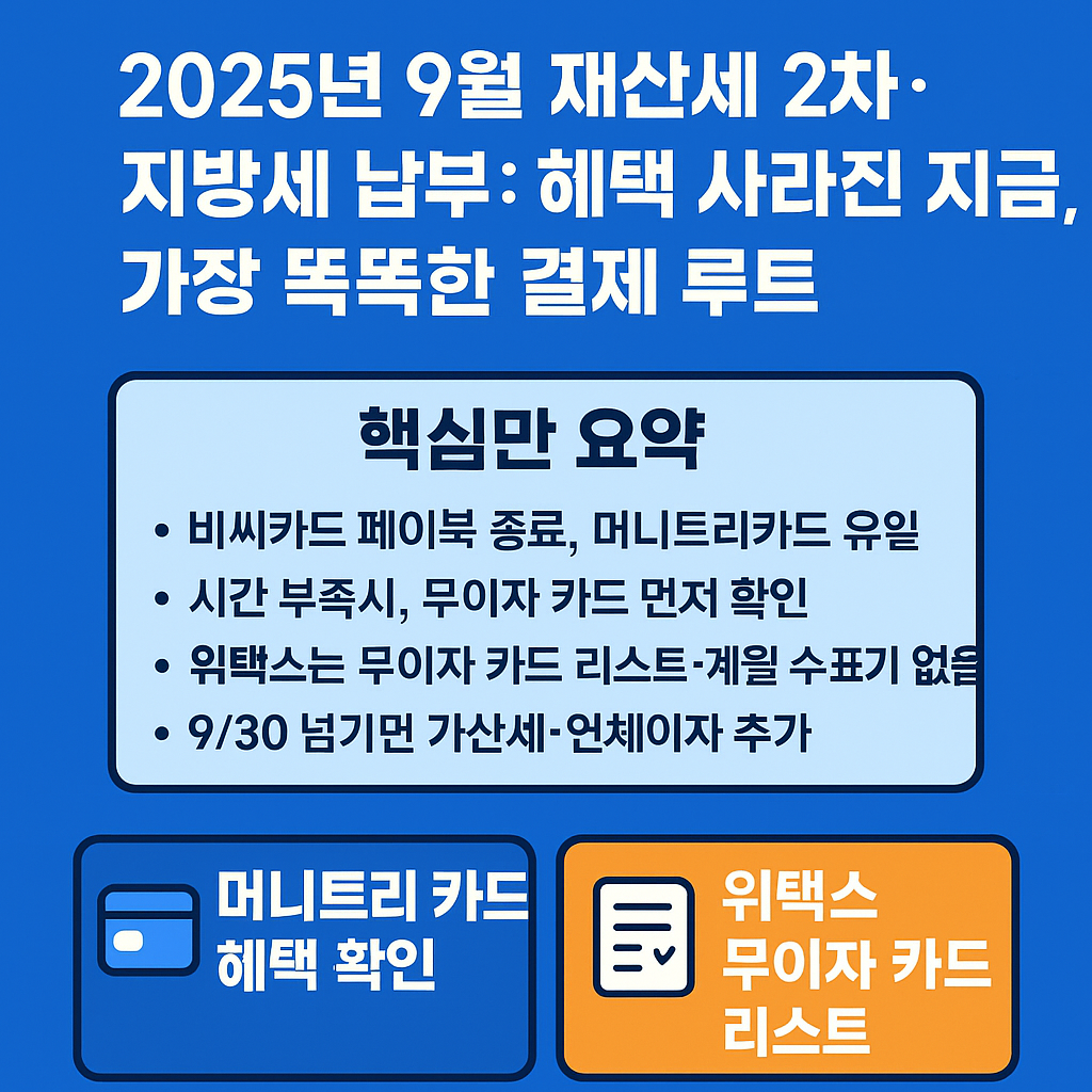 일부 카드사는 재산세 납부 시 무이자 할부 혜택이나 소정의 포인트 적립 이벤트를 제공합니다. 최근 사례는 머니트리 카드 납부 혜택 정리 글에서도 확인할 수 있습니다.