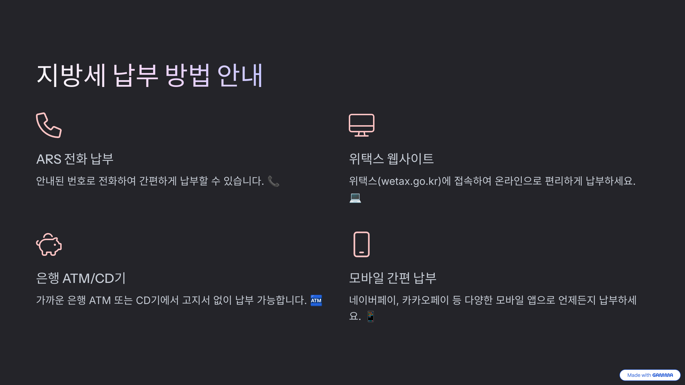 지방세 ARS 번호(예: 1544-1414)를 통해 카드로도 전화 납부가 가능하며, ‘지방세입계좌납부앱’을 활용하면 수수료 없이 이체도 가능합니다.