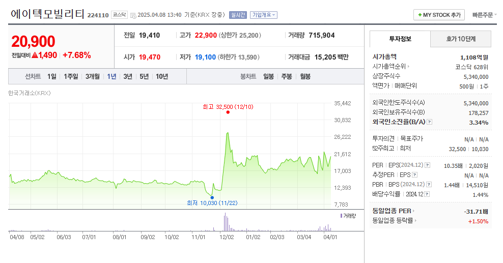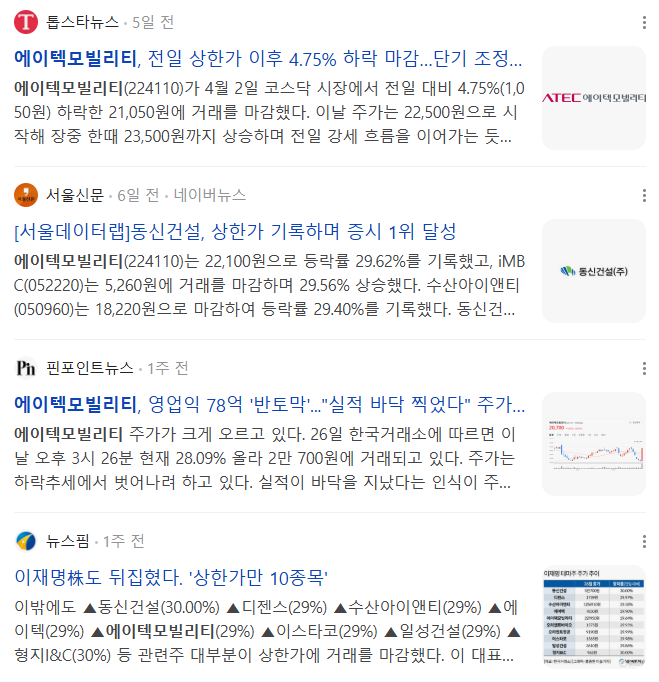 | 에이텍모빌리티 | 20,950 | +7.93% | 153억 3,700만 | 신승호 대표가 성남환경조정 CEO포럼 운영위원 |