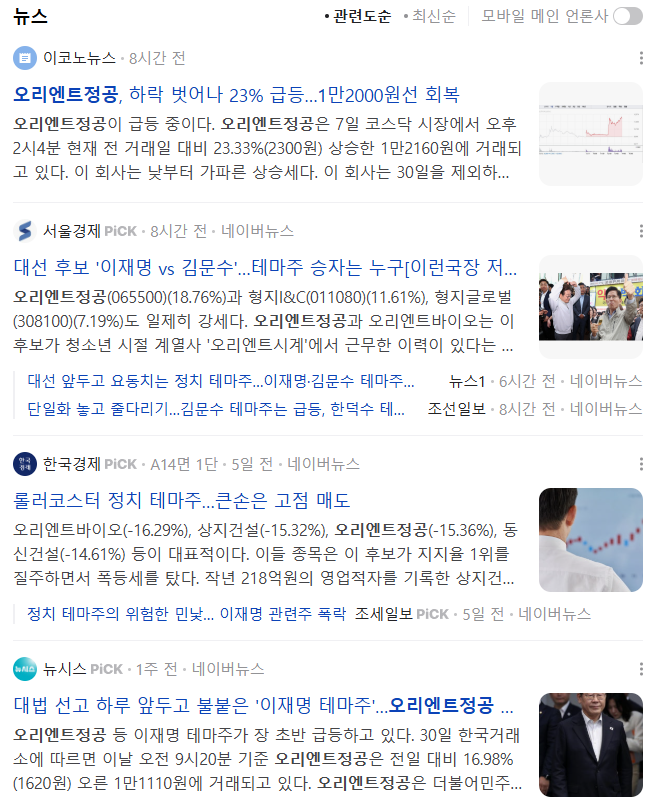 | 형지엘리트 | 3,020 | +6.15% | 120억 9,000만 | 이재명 후보의 무상교복 정책 수혜 기대 |