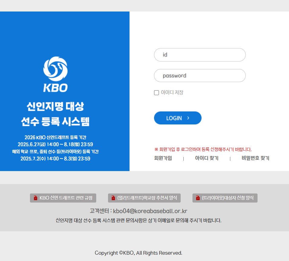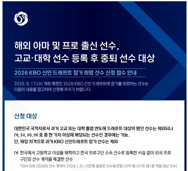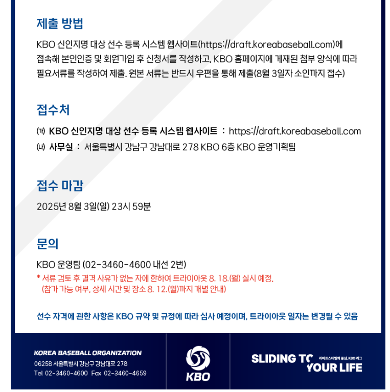 2025년 KBO 리그 신인드래프트에 참가하고자 하는 희망 선수들을 대상으로 참가 신청 접수가 시작되었습니다. 아래의 안내에 따라 관련 서류를 제출하고 절차를 진행해 주시기 바랍니다.