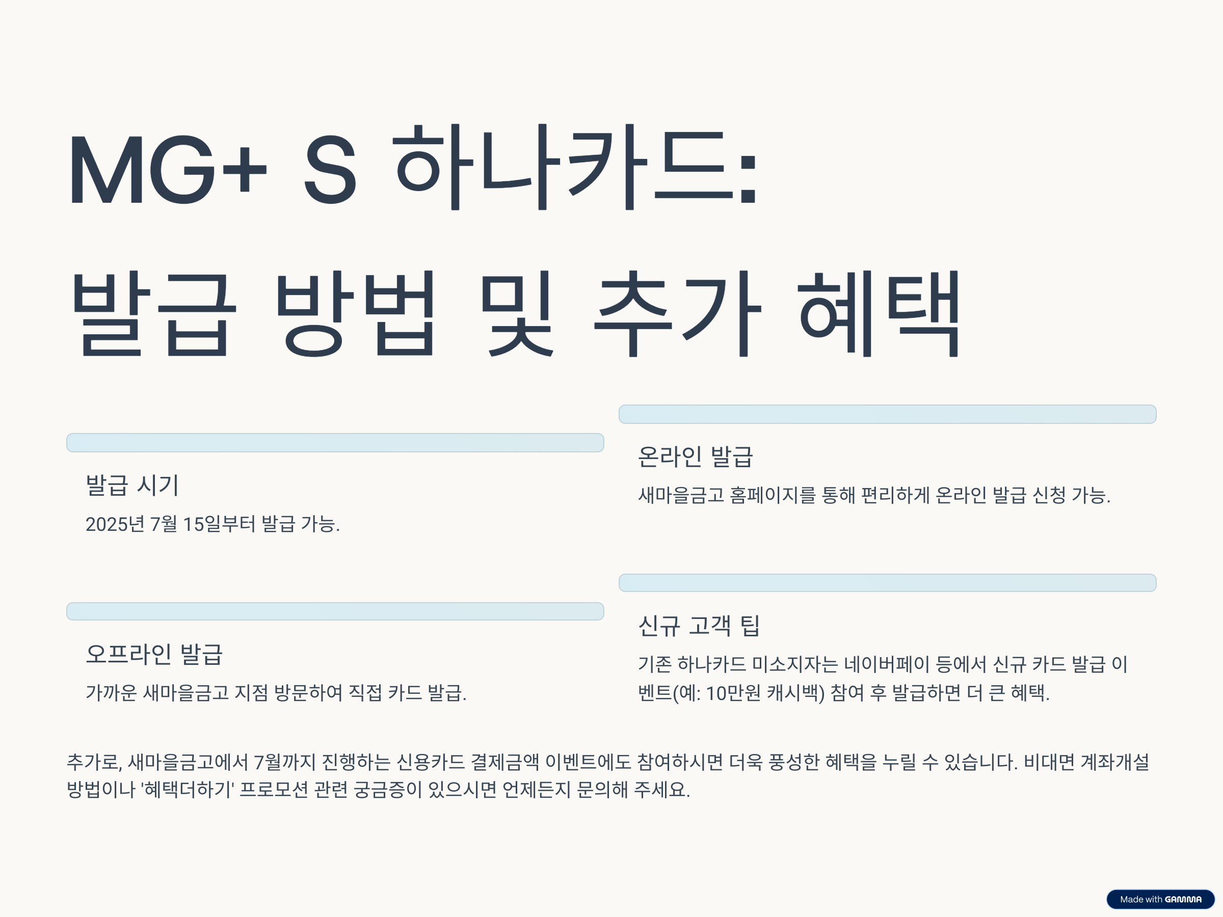 현재 MG+S 하나카드는 하나카드 공식 홈페이지 또는 새마을금고 영업점에서 신청 가능합니다. 일부 이벤트 페이지에서는 온라인 즉시 발급도 가능하며, 발급 후 곧바로 모바일 간편결제 등록 가능합니다.