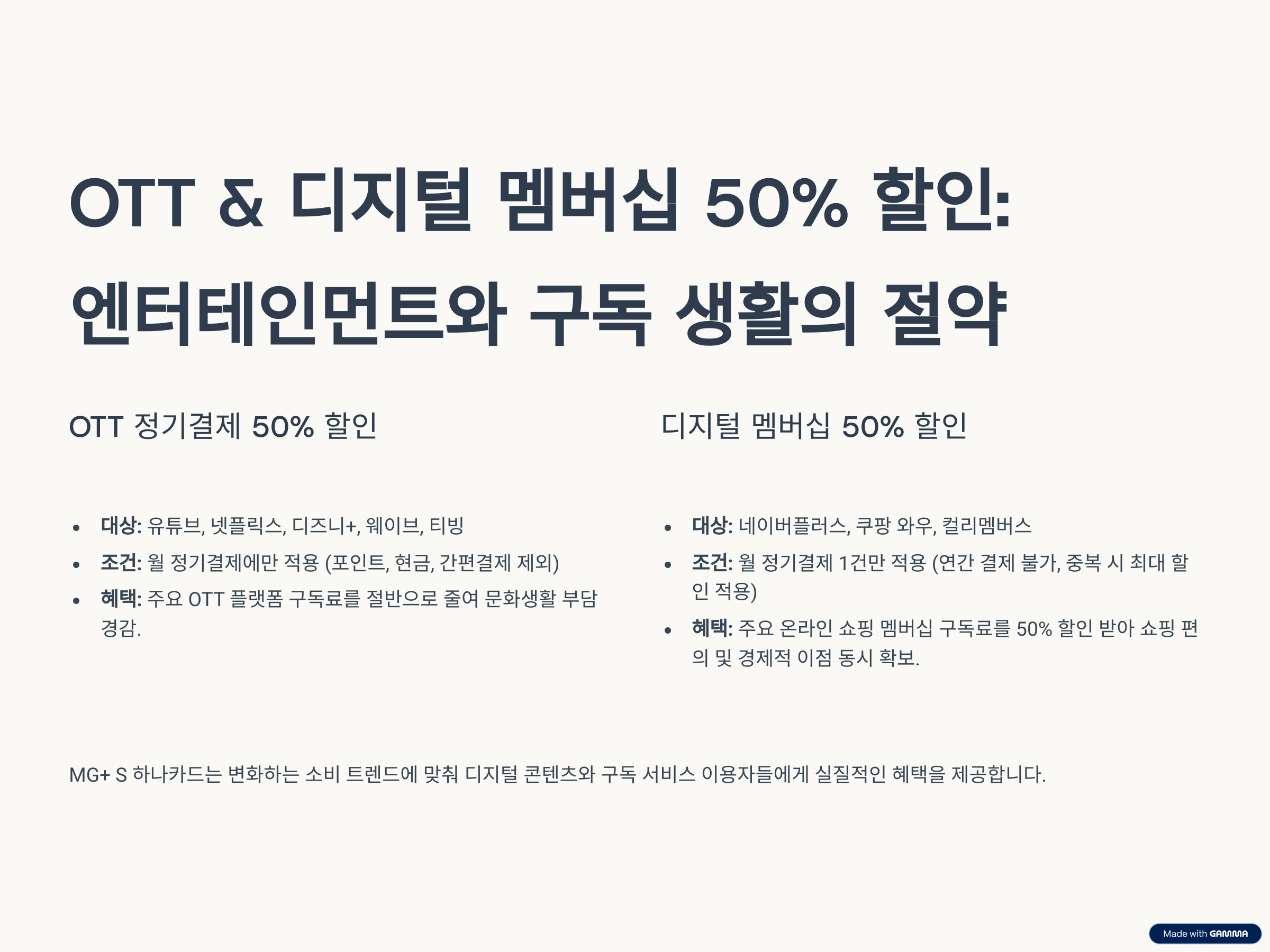 MG+S 하나카드는 온라인 결제(간편결제 포함) 항목에 대해 월 최대 6만원까지 할인 혜택을 제공합니다.
